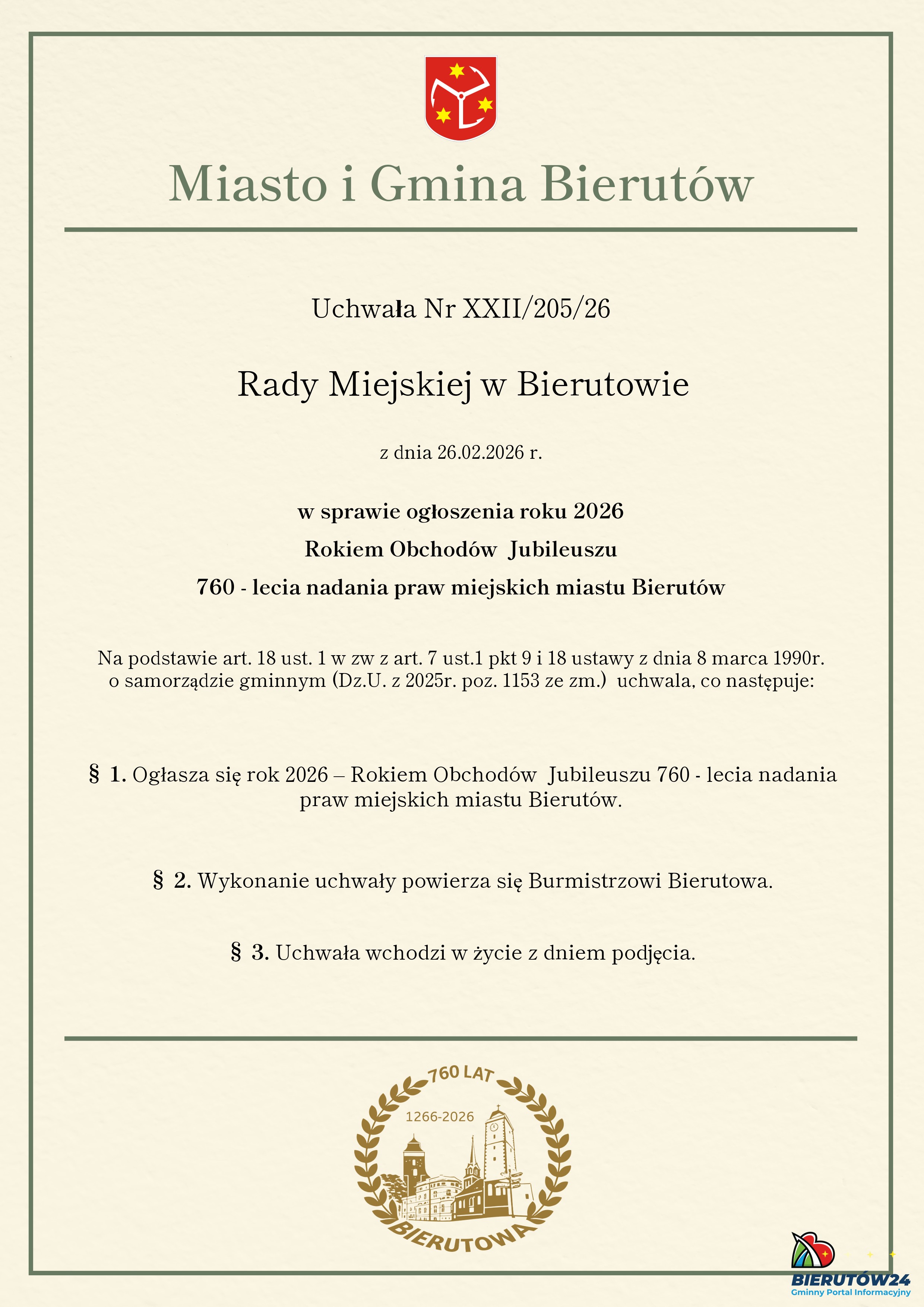 Rada Miejska w Bierutowie jednoglosnie oglosila rok 2026 Rokiem Jubileuszu 760-lecia nadania praw miejskich.